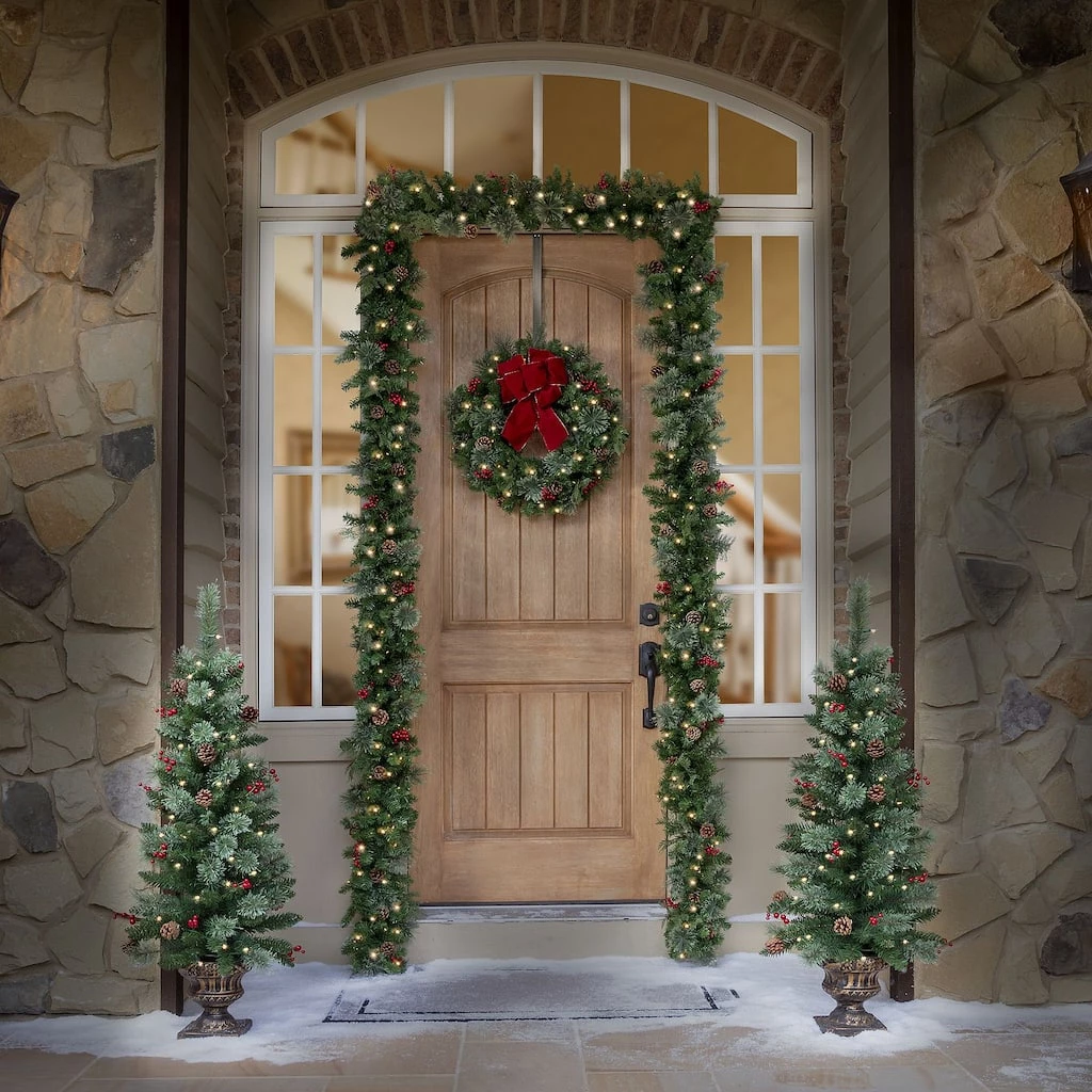 Perfect your Christmas dΓ©cor with this 9ft. Classic style Pre-lit Christmas Garland! This garland showcases an assortment of lush, mixed greenery, faux berries, and real pinecones. Pre-lit with 100 warm white LED lights this garland shines brighter than most and the light set is conveniently strung to allow you to connect multiple garlands together. The mixed greenery is creating a nice full garland perfect for mantels, railings, banisters and framing your exterior doors.