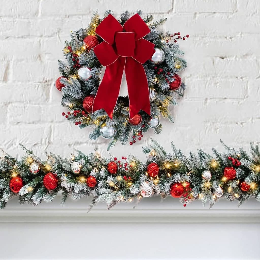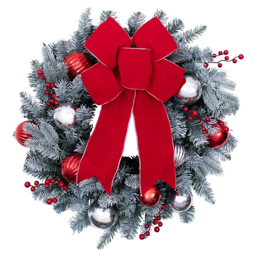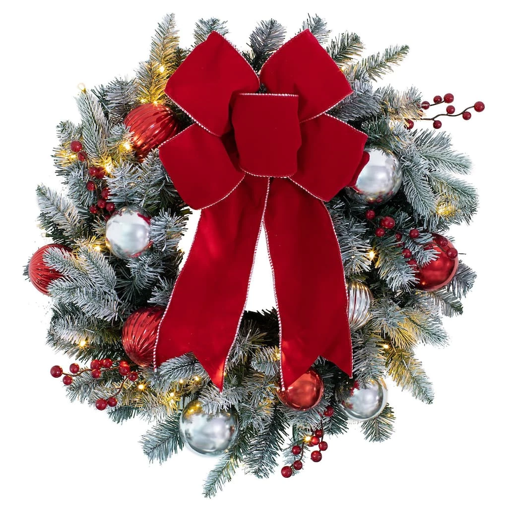 This Haute Decor 24″ White LED Frosted Wreath is full of snowy fun and charm! A beautiful Christmas wreath adorned with red and silver shatterproof ornaments, faux red berries, a wire-edged red bow, and 95 snow-tipped PVC mixed greenery. Pre-strung with 50 warm white LED lights that are brighter than most and has a built-in countdown timer that runs 6 hours on/18 hours off. The double wireframe is wrapped with PVC to prevent scratching the door while also adding stability to the wreath. The battery box locks into the frame which allows the wreath to lay flush against a flat surface.Β