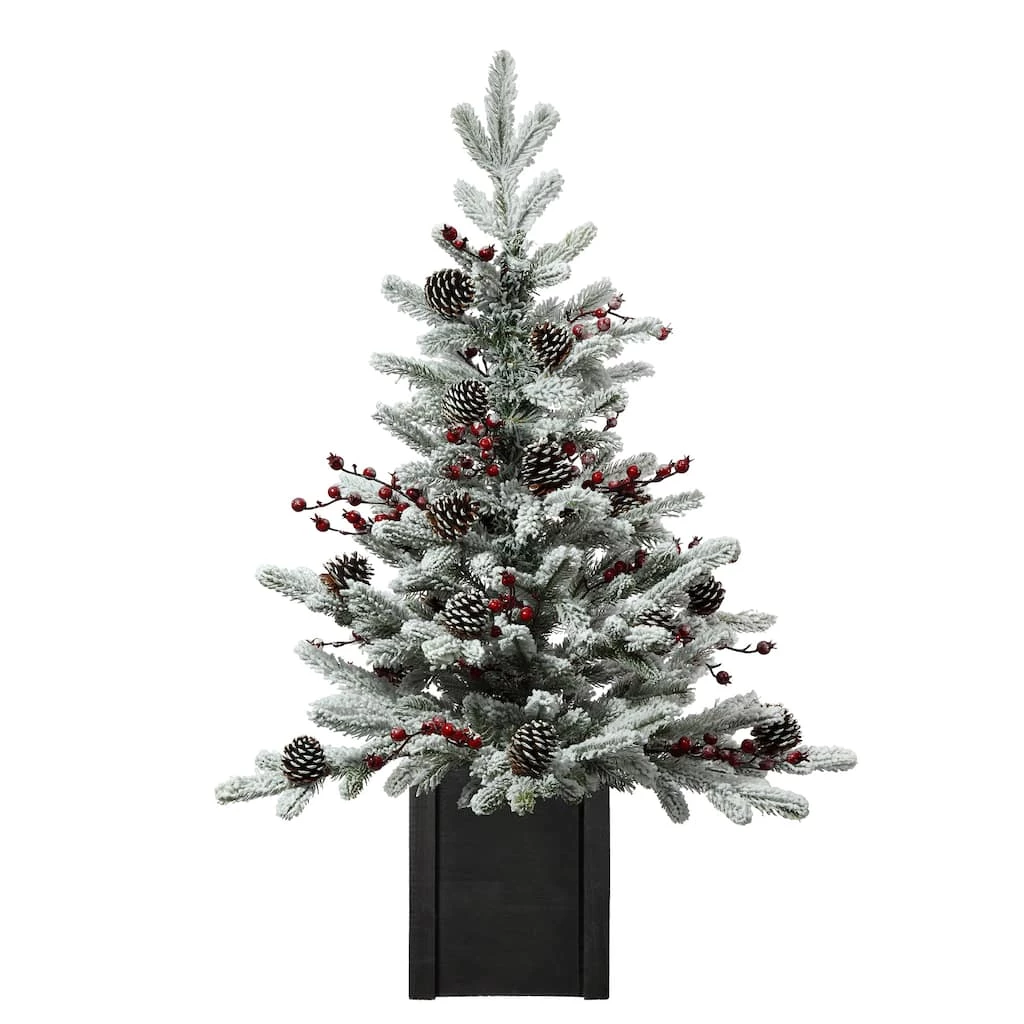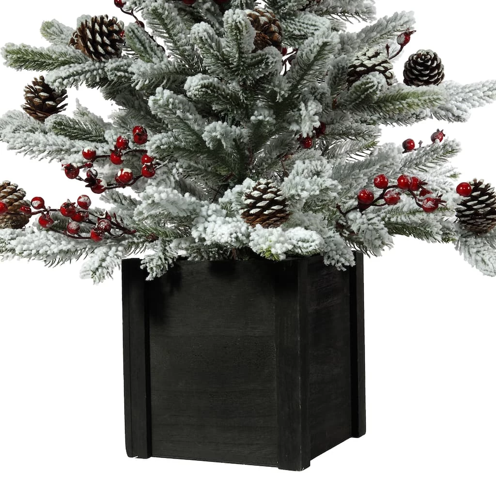 Create a snowy scene inside with our potted 36-inch Stockhorn Fir. Accented with berries and pinecones, then flocked to snowy perfection, this tree is ideal in a corner, or on a table or flanking the fireplace. It comes potted in a black wooded pot, and ready to display. The perfect Christmas tree for a small space.