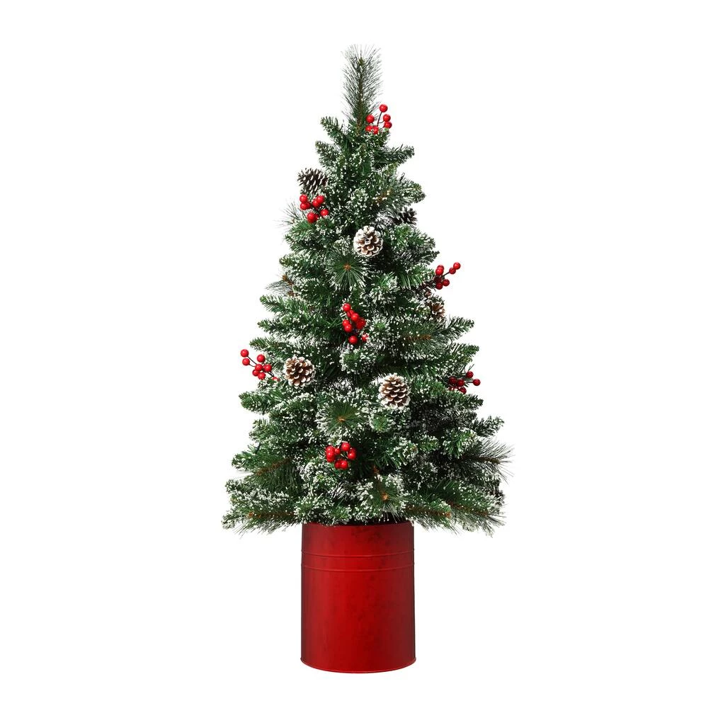 Lightly dusted with sparkling faux snow, this 48-inch tall potted tree is the perfect accent for your home. The tree can be used inside or outside, making it perfect to use in pairs by the front door, inside by the fireplace or on your covered porch. It comes prelit with 50 battery operated LED lights on a timer so you set it once and it will come on every day at the same time. With no cords to worry about, you can place it anywhere!