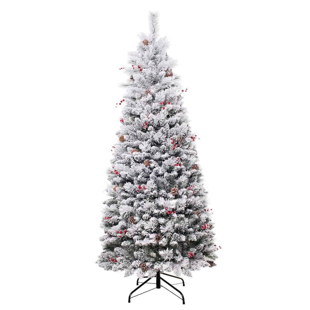 A flocked version of a Scotch Pine tree that you see in nature, this artificial Christmas tree looks real but assembles in minutes! This tree has a special feature that allows it to be stored in a wreath sized bag! The Flocked Newbury tree features 780 artificial greenery tips mixed with faux red berries and real pinecones and covered with a flocking material. Beautiful as is but can also be personalized with your favorite decorations and ornaments! Assembling the tree is easy; simply pull up the tree and attaching it to the poles. Shaping this tree is a breeze too! The tree measures 6.5-foot-tall with a 32-inch Diameter base which allows this tree to be perfectly placed almost anywhere in your home. 300 warm white concave LED lights sets off a beautiful glow at night.