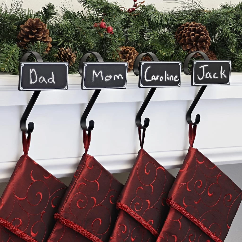 Stocking Scrolls with chalkboards are a fun way to personalize your stocking holders, yet capable of holding even the fullest stocking. Simply clip the chalkboard onto the Stocking Scroll and personalize (1 piece of chalk included)! The patented design enables Stocking Scrolls to swivel which allows it to fit almost any size or shape of mantel. Gripper pad helps hold the stocking holder in place while also protecting your mantel from scratches. The lightweight design makes it a safer option for homes with curious children or pets, versus heavy, counter-balance stocking holders.