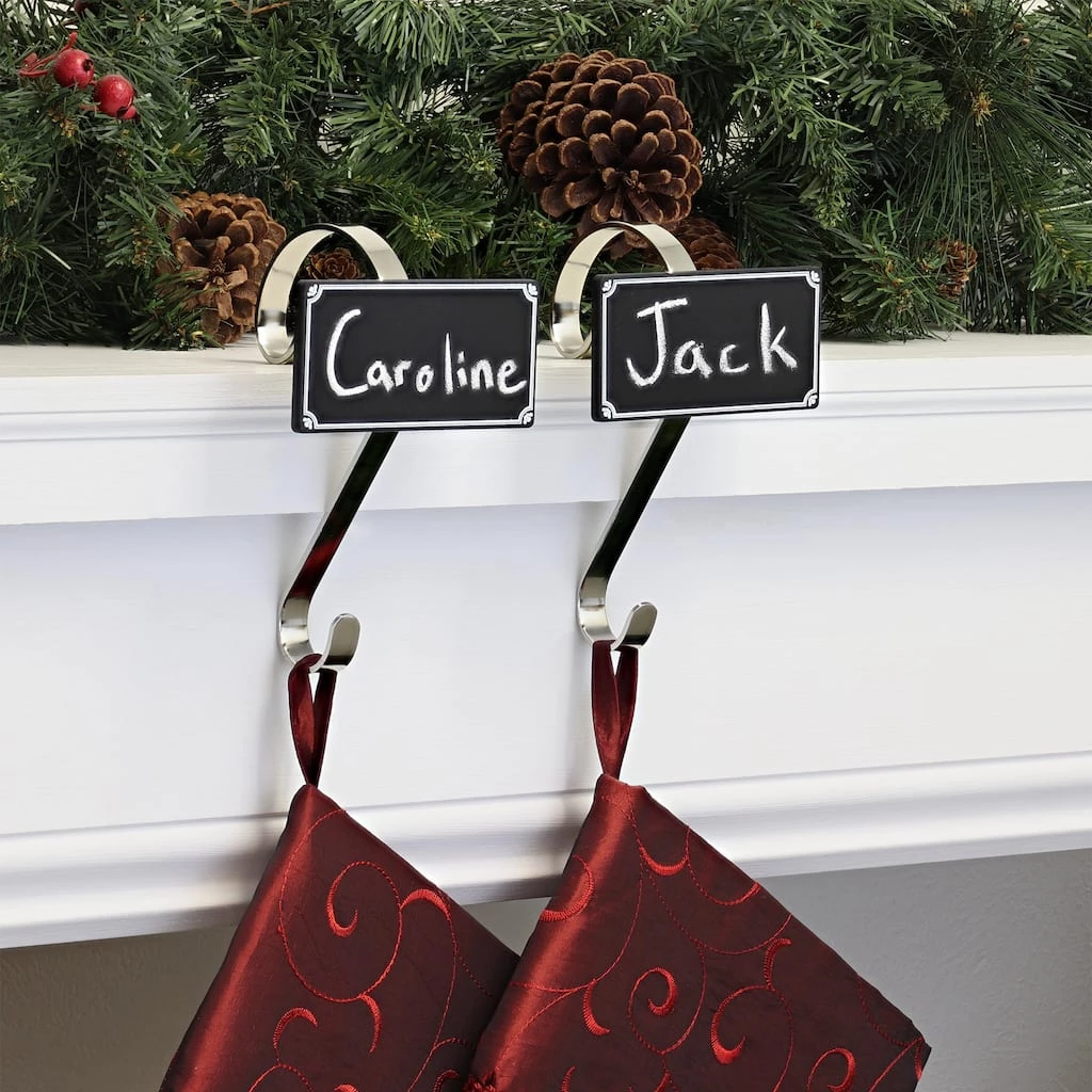 Stocking Scrolls with chalkboards are a fun way to personalize your stocking holders, yet capable of holding even the fullest stocking. Simply clip the chalkboard onto the Stocking Scroll and personalize (1 piece of chalk included)! The patented design enables Stocking Scrolls to swivel which allows it to fit almost any size or shape of mantel. Gripper pad helps hold the stocking holder in place while also protecting your mantel from scratches. The lightweight design makes it a safer option for homes with curious children or pets, versus heavy, counter-balance stocking holders.